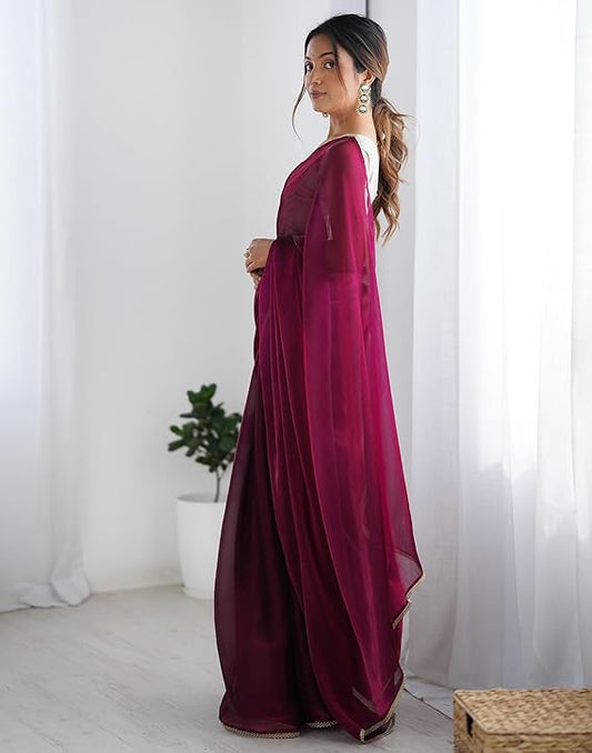 SARONA Women's Shimmer Chiffon Saree with Elegant Lace Border and Unstitched Matching Blouse Piece