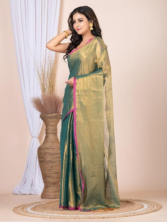 Selvaya Women's Tissue Cotton Saree with Tassel Pallu, Plain Borderless Design, Soft Lightweight Saree with Matching Blouse Piece for Festive & Casual Wear