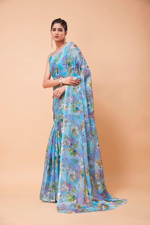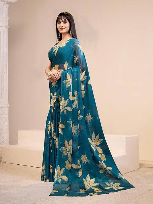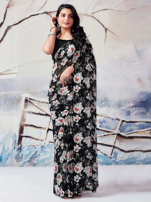 Mystique Flair Women's Designer Chiffon Saree with Elegant Floral Prints and Matching Blouse Piece